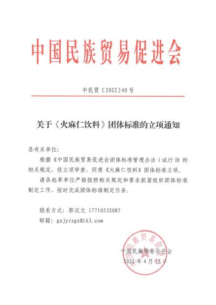 根据《中国民族贸易促进会团体标准管理办法(试行)》的相关规定,经立项审查,同意《火麻仁饮料》团体标准立项。