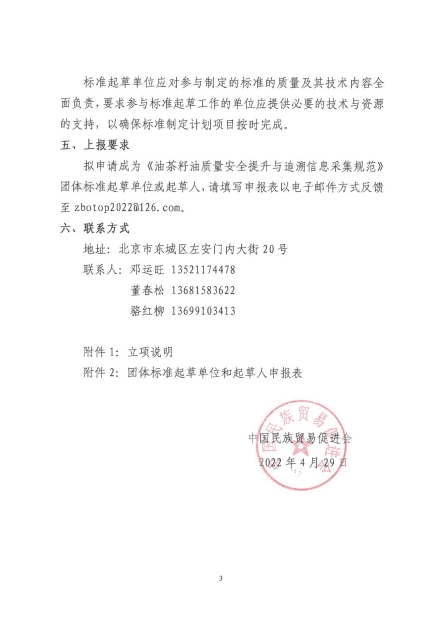 为贯彻落实《国家标准化发展纲要》和《关于培育和发展团体标准的指导意见》,依据《中华人民共和国标准化法》、《团体标准管理规定》和《中国民族贸易促进会团体标准管理办法(试行)》有关规定,我会批准由北京中建智创信息技术研究院具体实施执行的《油茶籽油质量安全提升与追溯信息采集规范》团体标准的制定计划。