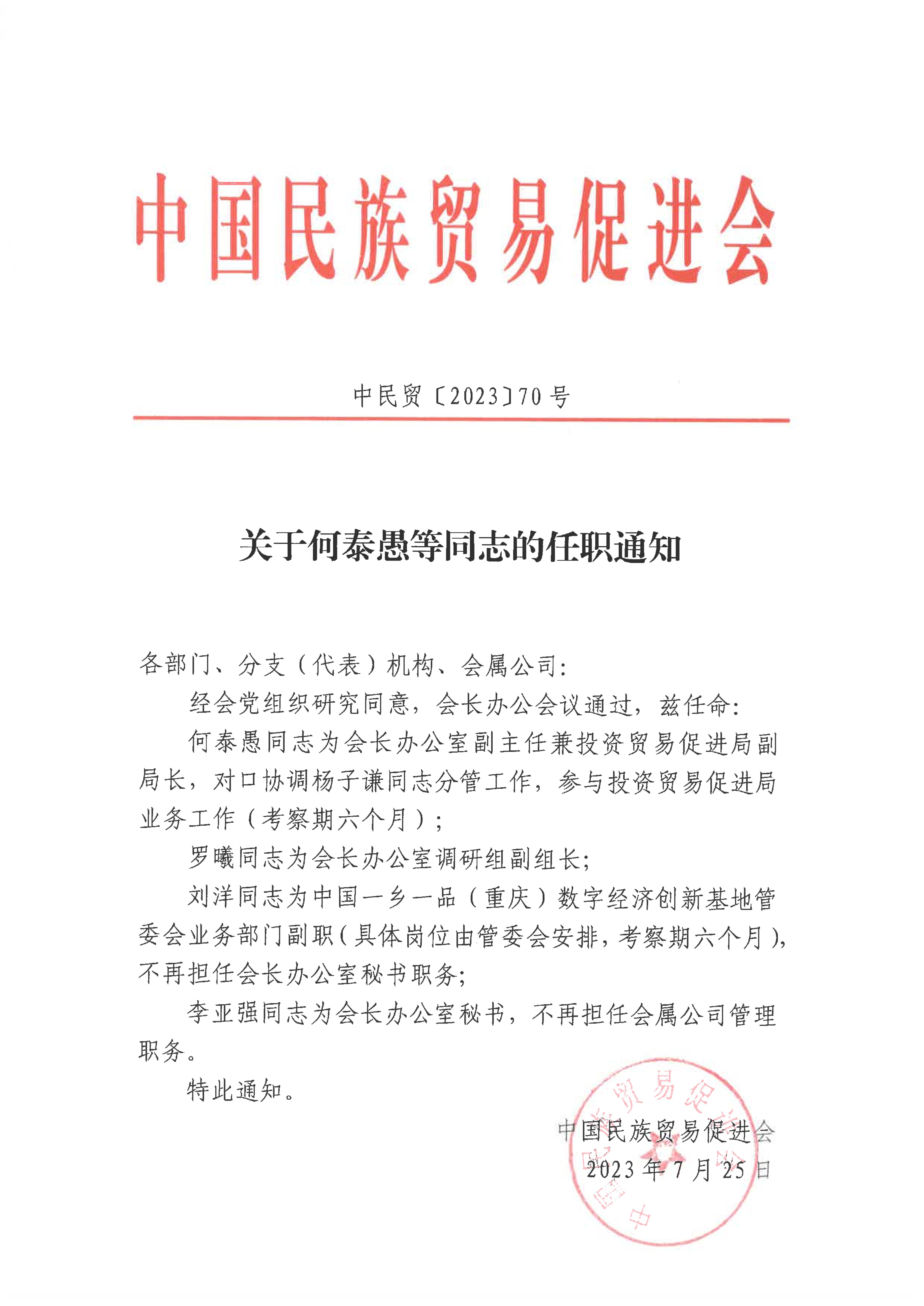 关于何泰愚等同志的任职通知