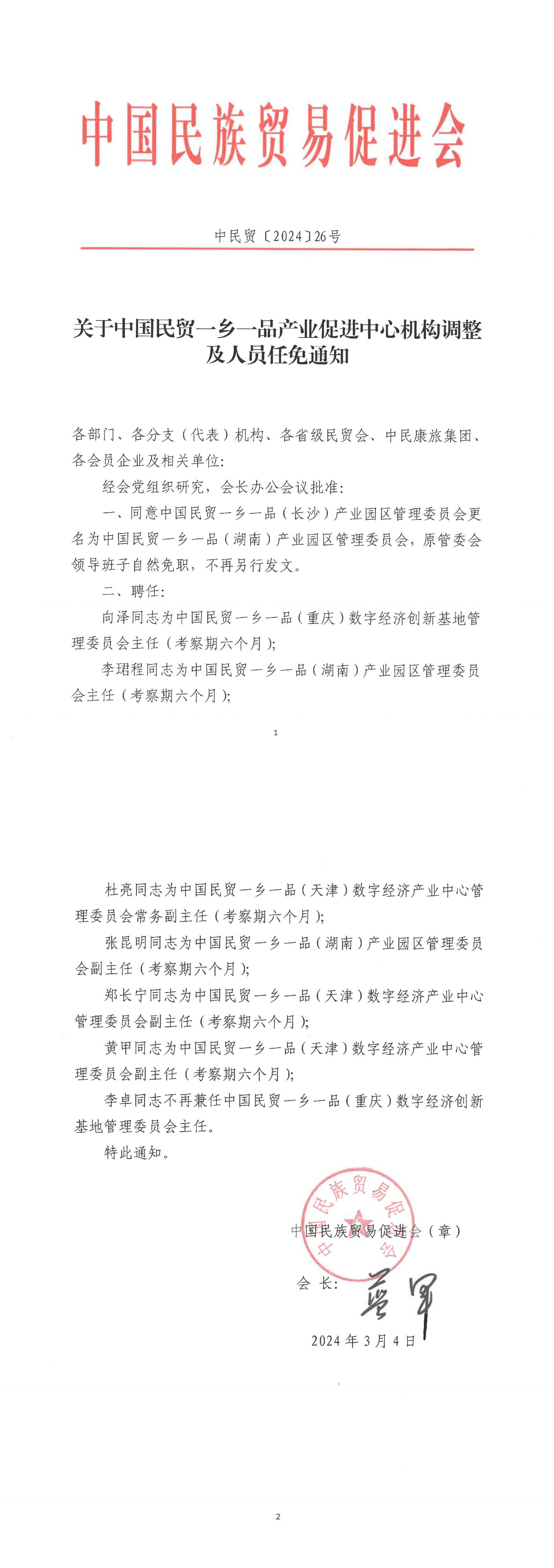 关于中国民贸一乡一品产业促进中心机构调整及人员任免通知